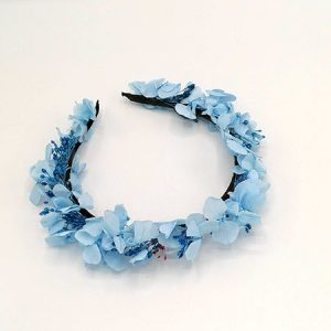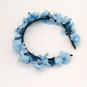 Coronita Celeste de flores naturales liofilizadas y preservadas de tonos celestes y azules con hortensias