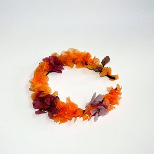 Coronita Mandarina de flores naturales liofilizadas y preservadas de tonos naranjas y morados con hortensias
