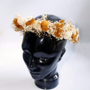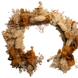 Coronita Natur de flores naturales liofilizadas y preservadas de tonos ocres y cremas con hortensia y paniculata