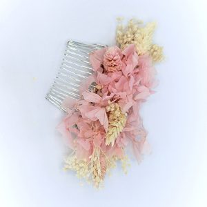 Tocado para recogido con tonos rosas y cremas con flores liofilizadas y preservadas con hortensia y paniculata