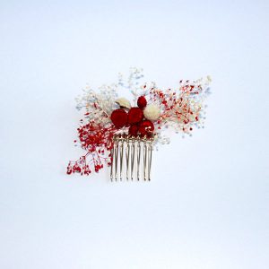 Tocado para recogido con tonos rojos y blancos con flores liofilizadas y preservadas