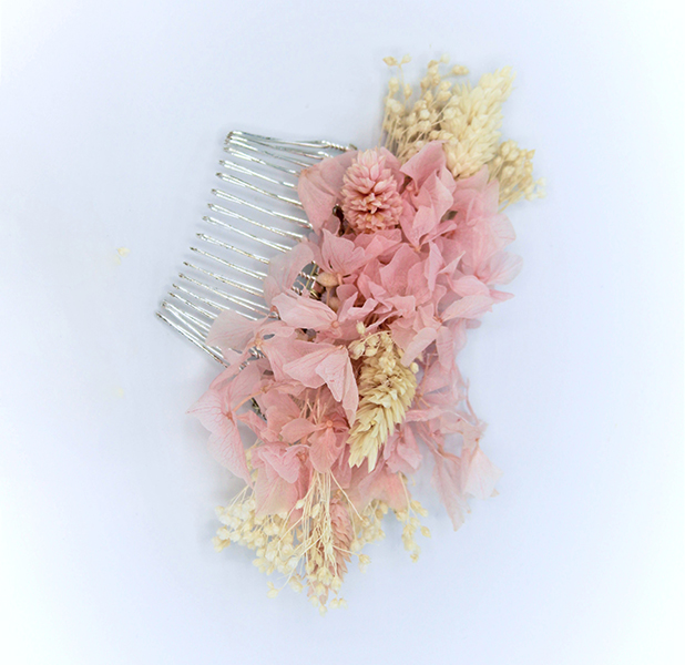 Peineta Cloe con tonos rosas y cremas con flores liofilizadas y preservadas con hortensia y paniculata. Tocado para recogido con tonos dulces y suaves. Te asesoramos y realizamos la peineta con la tonalidad y la medida que necesites