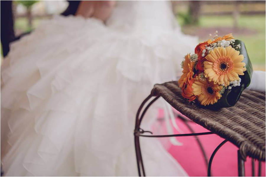 Ramo de novia Anna de flores naturales con tonos cálidos. Se compone de Gerberas grandes de color pastel y Ronunculus de color naranja y acabado en verde con hojas de Aspidistra. Bouquet ideal para novias juveniles y alegres