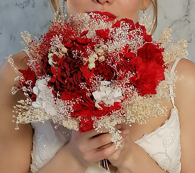 Ramo de novia Fénix con tonos rojos y blancos, el color rojo pasional con el color blanco puro son colores atractivos y atrevidos para una novia con seguridad y energía. Bouquet de flores liofilizadas y preservadas para que perdure tu recuerdo en tu hogar. Se hacen réplicas, pulseras y tocados de conjunto