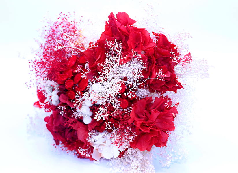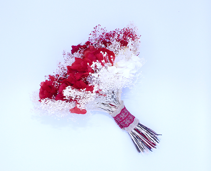 Ramo de mano Fénix con tonos rojos y blancos de flores naturales liofilizadas